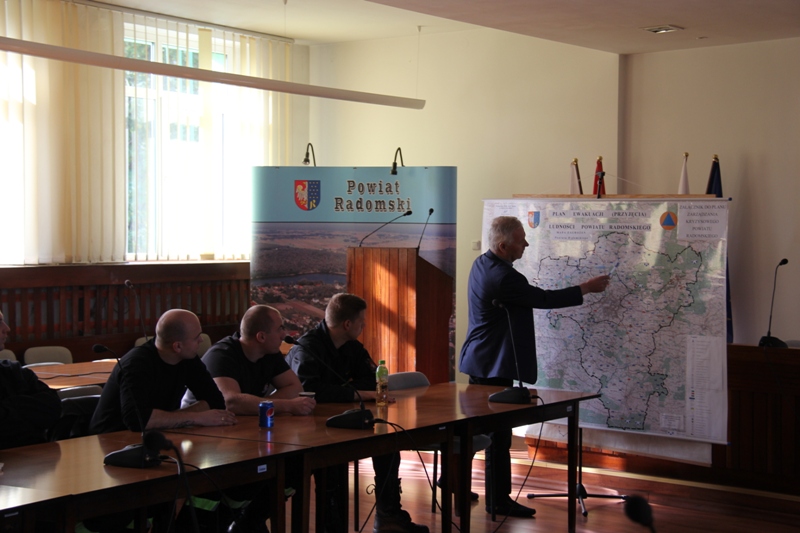 Spotkanie otworzył naczelnik Wydziału Zarządzania Kryzysowego Sławomir Płaza, który podziękował uczestnikom za przybycie i przedstawił cel zajęć. Scharakteryzował również zarys zagrożeń wstępujących na terenie powiatu radomskiego. W dalszej części Strażacy zapoznali się z funkcjonowaniem systemu Zarządzania Kryzysowego oraz z najważniejszymi punktami newralgicznymi w powiecie takimi jak: zbiornik wodny w Domaniowie, oraz tereny po byłych zakładach „PRONIT” S.A. w Pionkach.
