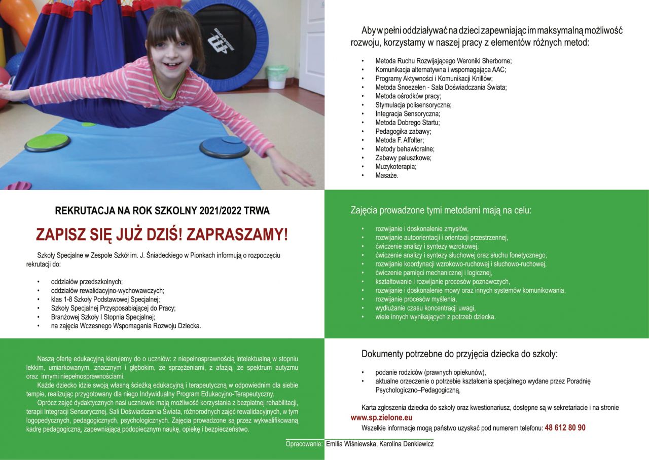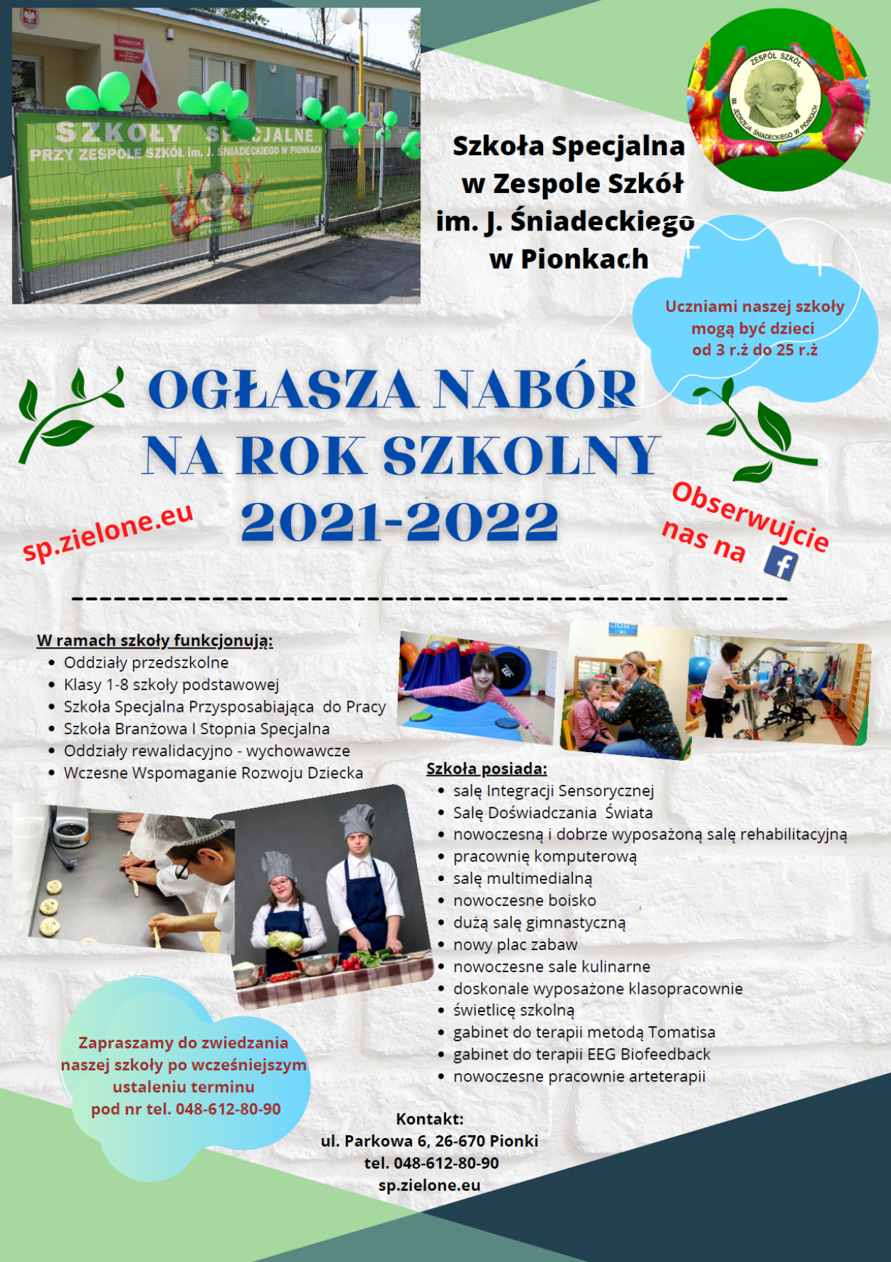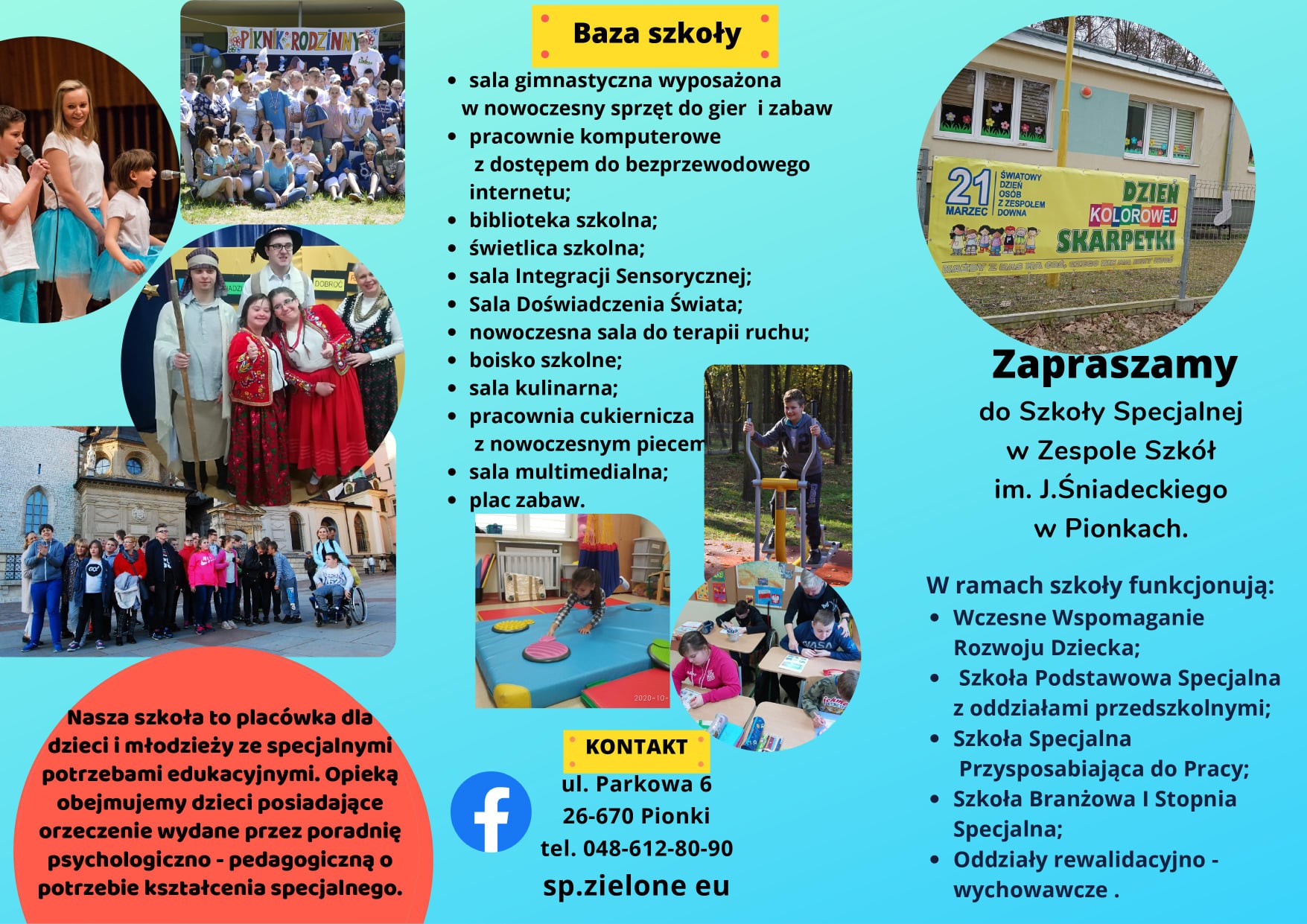 Szkoła Specjalna w Zespole Szkół im. J. Śniadeckiego w Pionkach to placówka, której oferta skierowana jest dla dzieci i młodzieży ze specjonalnymi potrzebami edukacyjnymi: z niepełnosprawnością intelektualną w stopniu lekkim, umiarkowanym, znacznym i głębokim, ze sprzężeniami, z autyzmem.