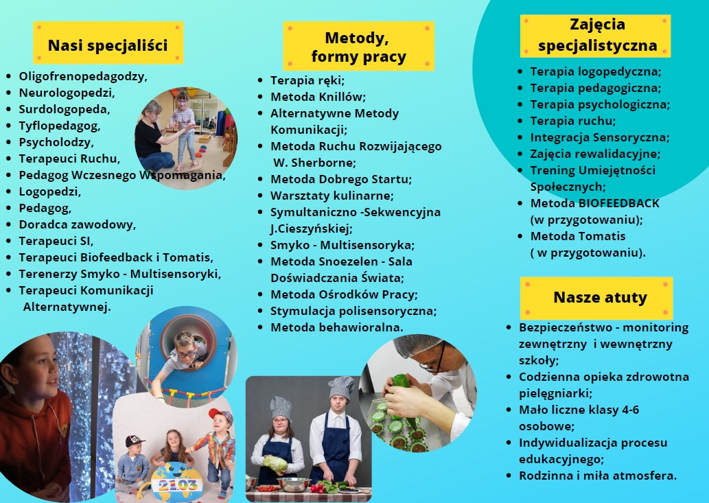 Szkoła zapewnia kompleksową opiekę, komfort i bezpieczeństwo podopiecznych, wspomaga proces terapii i rehabilitacji. Zajęcia dydaktyczne prowadzone są w małych grupach 4-5 osobowych, którymi zajmuje się wychowawca oraz pomoc nauczyciela. Wykwalifikowana kadra pedagogów, logopedów, psychologów i fizjoterapeutów czuwa nad rozwojemprawidłowym rozwojem dzieci. Każde dziecko ma tworzony indywidualny program edukacyjno – teraputyczny, uwzględniający możliwości i potrzeby rozwojowe wychowanka.