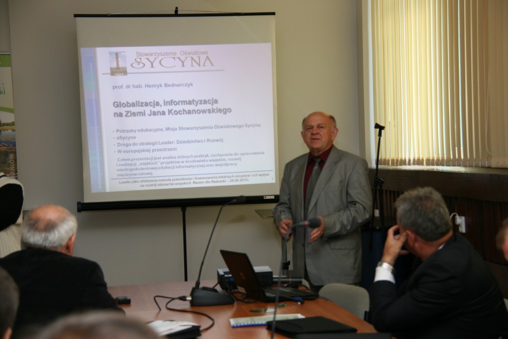 „Leader jako efektywna metoda pobudzania i finansowania lokalnych inicjatyw i ich wpływ na rozwój obszarów wiejskich” to temat konferencji, której organizatorami byli: Lokalna Grupa Działania „Razem dla Radomki” i Starostwo Powiatowe. Honorowy patronat objął Starosta Mirosław Ślifirczyk. W trakcie obrad zaprezentowano tak ważne zagadnienia, jak: „LEADER – efektywna metoda pobudzania i finansowania lokalnych inicjatyw na przykładzie LGD „Razem dla Radomki” które przedstawił jej prezes Cezary Nowek. Poinformował on o dotacjach na finansowanie lokalnych inicjatyw, które przyczyniają się do wzrostu atrakcyjności i rozwoju gospodarczego poprzez aktywizację społeczeństwa oraz wykorzystanie unikalnych walorów przyrodniczych, kulturowych i historycznych gmin. „Globalizacja, informatyzacja na Ziemi Jana Kochanowskiego” – to kolejny temat który omówił prof. dr hab. Henryk Bednarczyk, prezes Stowarzyszenia Oświatowego SYCYNA. Głównym celem działalności stowarzyszenia jest integracja, samoorganizacja i aktywizacja lokalnych społeczności. Zaznaczył, że niezbędna jest radykalna poprawa umiejętności informatycznych umożliwiających rozwój e-learningu oraz dostępu do internetu na wsi. Podczas spotkania zostały przedstawione również zagadnienia: „Współpraca: LGD – samorząd”, które omówił wójt gminy Zakrzew Sławomir Białkowski”, a dotyczyły one rozwoju ekologii i pozyskiwania środków z UE na potrzeby środowiska wiejskiego. Krzysztof Zaniewski z Urzędu Marszałkowskiego zaprezentował temat „Produkty regionalne, tradycyjne na Mazowszu – identyfikacja, promocja, korzyści”. Omówiono również: „Wsparcie rolników i przedsiębiorców w ramach osi 3 i 4 PROW”. Przedstawił je Mariusz Kostka – dyrektor Mazowieckiego Oddziału Regionalnego ARIMR w Warszawie. O doświadczeniach LGD południowego Mazowsza we wdrażaniu idei LEADER i rozwoju lokalnego omówiła m. in. prezes LGD subregionu radomskiego Teresa Majkusiak – prezes Lokalnej Grupy Działania „Wspólny Trakt”, która wspiera rozwój turystyki, agroturystyki, imprezy sportowe i kulturalne, promujące obszar działania stowarzyszenia.