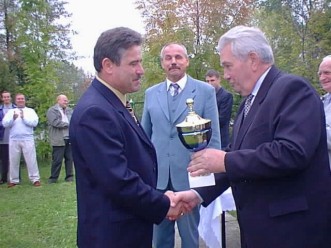 Na zdjęciu: Puchar od starosty odbiera szef i właściciel „KAJMEXU” Kazimierz Sielwanowski, w środku Włodzimierz Bojarski.