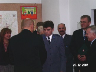 W dalszej części uroczystości przewodniczący Rady Powiatu Edward Krok (fot.3 trzeci z lewej) na ręce komendanta A. Chanieckiego przekazał medal dla policji „Zasłużony dla Powiatu Radomskiego”, natomiast wicestarosta Krzysztof Górak, dziękując za owocną współpracę i pomoc w realizacji programu „Bezpieczny Powiat”- komputer, monitor LCD, oraz drukarkę laserową Xerox.
